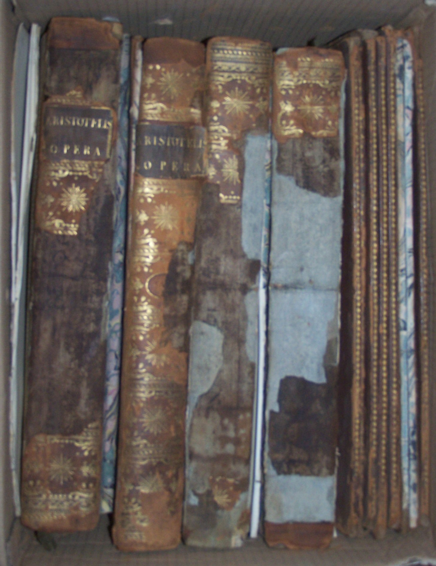 Opera omnia quae extant graece & latine … ut Adriani Turnebi, Isaaci Casauboni, Iulii Pacii studio emendatissima, cum Kyriaci Strozae … libros duos graecolatinis de Republica in supplementum Politicorum Aristotelis … Authore Guillielmo Du Val … Paris: Typis Regiis, apud Societatem Graecarum Editionum, 1629, 2 volumes in 4, large folio, title-pages in red and black, with engraved portraits of Aristotle on the title-page, woodcut initials and headpieces, text in two columns of Latin and Greek, 18th century calf, worn and rubbed, spines damaged, boards detached, title-pages a little dusty and slightly discoloured, with early library stamps, margin of the last leaf of the second volume water stained (4)