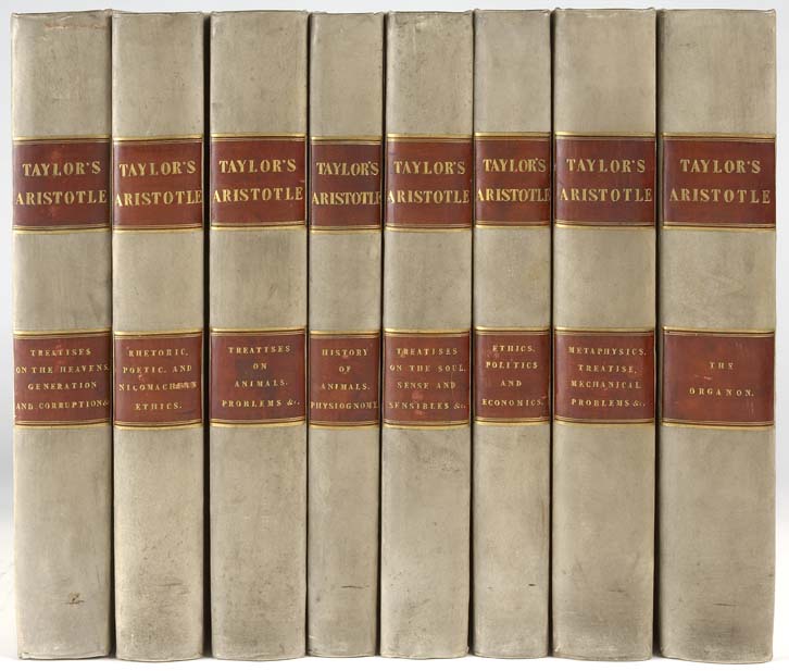 Note: Lowndes 68: Schwab 417, Raine & Mills Taylor, p. 526. Present of The Works are: The organon, 1807: On the heavens, 1807, On the soul, etc., 1808; History of animals, 1809; Parts & progressive motions of animals, etc., 1810; Ethics, 1811; Rhetoric, 1811; Metaphysics, 1812 and not including the Disseration on the philosophy sometimes found. Publication was limited to fifty sets. The 1801 edition of the Metaphysics contains material not reprinted in the collected works.