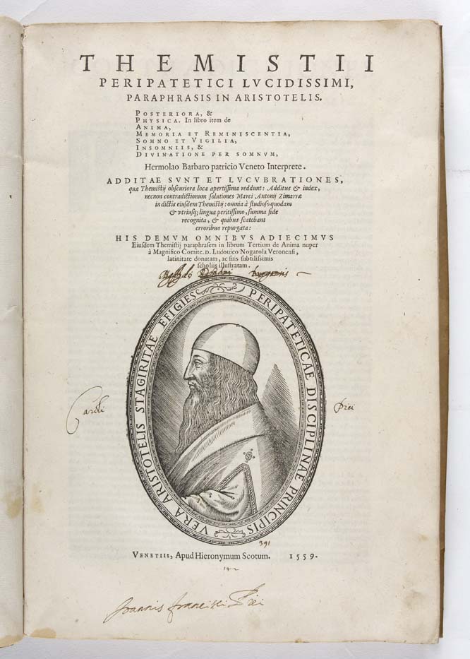 Themistii peripatetici … paraphrases in Aristotelis. Posteriora, &., Physica. In libro octo, Anima, [etc.] …. Additus & indes, necnon contractionum solutions Marci Antonii Zimarrae in dictis eiusdem Themistii … His demum omnibus adiecimus eisudem Themistii paraphrsem in librum tertium de Anima …a … Ludovico Nogarola … latinate donatam … Venice: apud Hieronymum Scotum, 1559., folio, woodcut portrait of Aristotle on the title-page, printer's device at the end, woodcut initials, contemporary limp vellum, over-lapping fore-edges, couple of early ownership inscriptions on the title-page, worm hole in lower margin of second half, small piece lost from the upper margins of the last half dozen leaves, (no loss), a few leaves with slight paper discolouration, with the terracotta bookplate of the University of Chicago Library