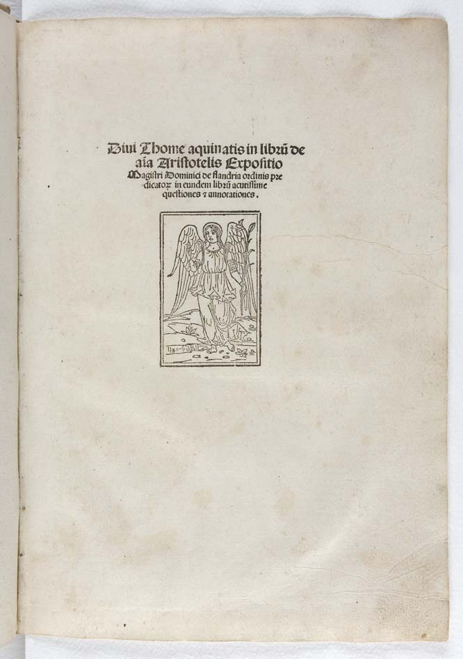 Divi Thome Aquinatis in libru de aia Aristotelis expositio magistri Dominici de flandria ordinis predicator in eundem libru acrissime questiones & annottaiones. [Venice: per Petrum de Quarenghis, 1501] Folio, ff. [xcv], Black Letter, text in two columns, capitals blank with guide letters, woodcut of an angel on the the titlepage and of Aquinas on the first leaf of text later vellum, endpapers renewed, marginal notes in an early hand