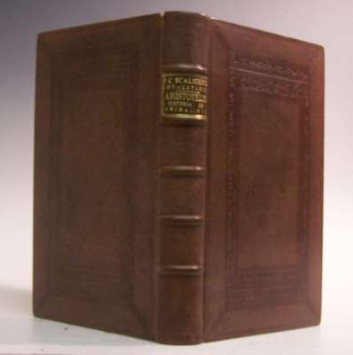 [Greek title-page]. Historia de animalibus, Iulio Caesare Scaligero interprete, cum eiusdem commentariis … [Greek and Latin text; edited by Philippe Jacques de Maussac]. Tolouse: apud Domincum & Petrum Bosc, 1619. Folio, large vignette on the title-page, title-page in red and black, modern blind tooled calf, endpapers renewed, library blind stamp on the title-page and cancellation stamp on the verso, unifor paper discolouration throughout, spotting, repair to margin of last leaf (no loss)