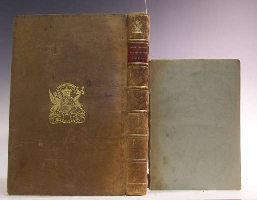 Sancti Thomae Aquinatis … commentaria in octo physicorum Aristotelis libros …cum duplici textus translatione, antiqua, & Argyropoli recognitis. Ad hac accessit Roberti Linconiensis in eosdem summa. Paris: apud Societatem Bibliopolarum, 1660. Large folio, 2 volumes in 1, title-page to volume 1 in red and black, woodcut portrait of the angelic doctor on the title-page, text in two columns, woodcut diagrams in the text, 18th century diced calf, with the gilt arms of the Earl of Malmesbury on both covers, joints worn, edges rubbed, light paper discolouration throughout