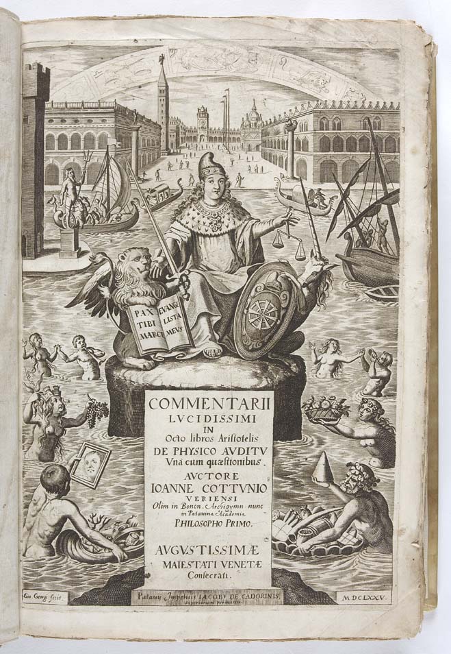Commentarii … in octo libros Aristotelis De physico auditu una cum quaestionibus … Padua: impensis Iacobi de Cadorinis, 1675. Folio, half-title, engraved title, (possibly lacking printed title?), light woodcut diagrams in the text, modern vellum over wooden boards, red morocco lettering piece, fore-edges uncut, water staining of upper outer corner of first few signatures and of pp. 375-382, 517-575, a few leaves discoloured, occasional marginalia, last leaf stained, with repair to the lower margin (no loss)
