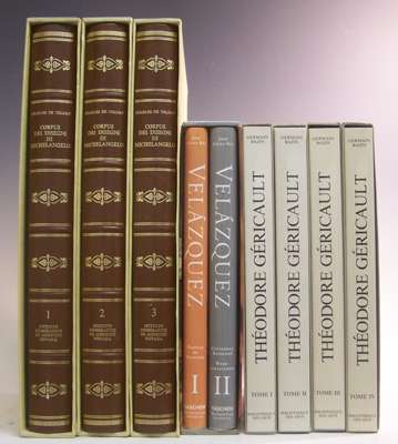Théodore Géricault. Paris, 1987-1990, 4to, 4 volumes, original cloth, dustwrappers, slipcases, a fine set; Tolnay, Charles de Corpus dei disegni di Michelangelo. Novara, 1975, folio, 3 [of 4] volumes, original quarter calf gilt, slipcases, a fine set; López-Rey, José Velázquez, catalogue raisonné. Taschen, 1996, 4to, 2 volumes, original cloth, dustwrappers, slipcase; Wiseman, Caroline Elisabeth Frink, original prints catalogue raisonné. London, 1998, 4to, dustwrapper, a fine copy; Gudiol, Jose Goya 1746-1828. Barcelona, 1985, 4to, 2 volumes, original cloth, dustwrapper, slipcase [worn at edges]; Tuchman, Maurice, et al. Chaim Soutine, catalogue raisonné. Cologne, 1997, 4to, 2 volumes, dustwrapper, slipcase, a fine pair; Rooses, Max Rubens. London, 1904, 4to, 2 volumes, later half morocco gilt, rubbed; Northcote, James The life of Titian. London, 1830, 8vo, 2 volumes, portrait frontispiece, contemporary half calf, crudely rebacked, inner hinges strengthened, bookplate of Lord Selborne and 20 other art reference works (39)