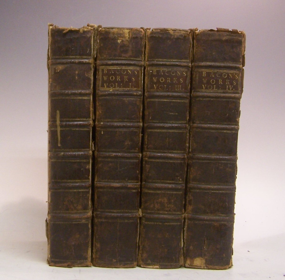 The works. London: A. Millar, 1740, 4 volumes, folio, engraved frontispieces, titles printed in red and black, contemporary calf, extremities worn, joints splitting, internally clean; Ibid. The philosophical works. London: J.J. & P. Knapton, 1733, 3 volumes, 4to, edited by P. Shaw, contemporary panelled calf, extremities worn, joints splitting; and 7 later editions of Bacon, one lacking a board