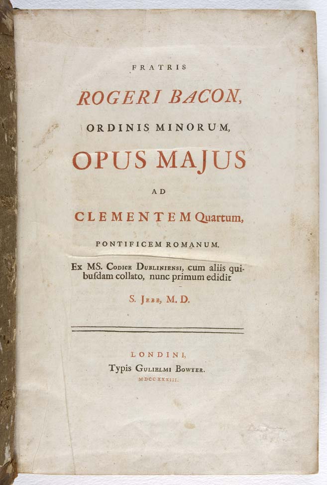 Opus majus ad Clementem quartum, pontificem Romanum. Ex MS Codice Dubliniensi, cum aliis quibusdam collato, nunc primum edidit S.Jebb. London: typis Gulielmi Bowyer, 1733. First edition, folio, titlepage in red and black, folding table and two plates, contemporary mottled, rebacked, joints split, edges rubbed, titlepage and last leaf a little dusty, marginal tear in p. 123 (no loss), some internal stains