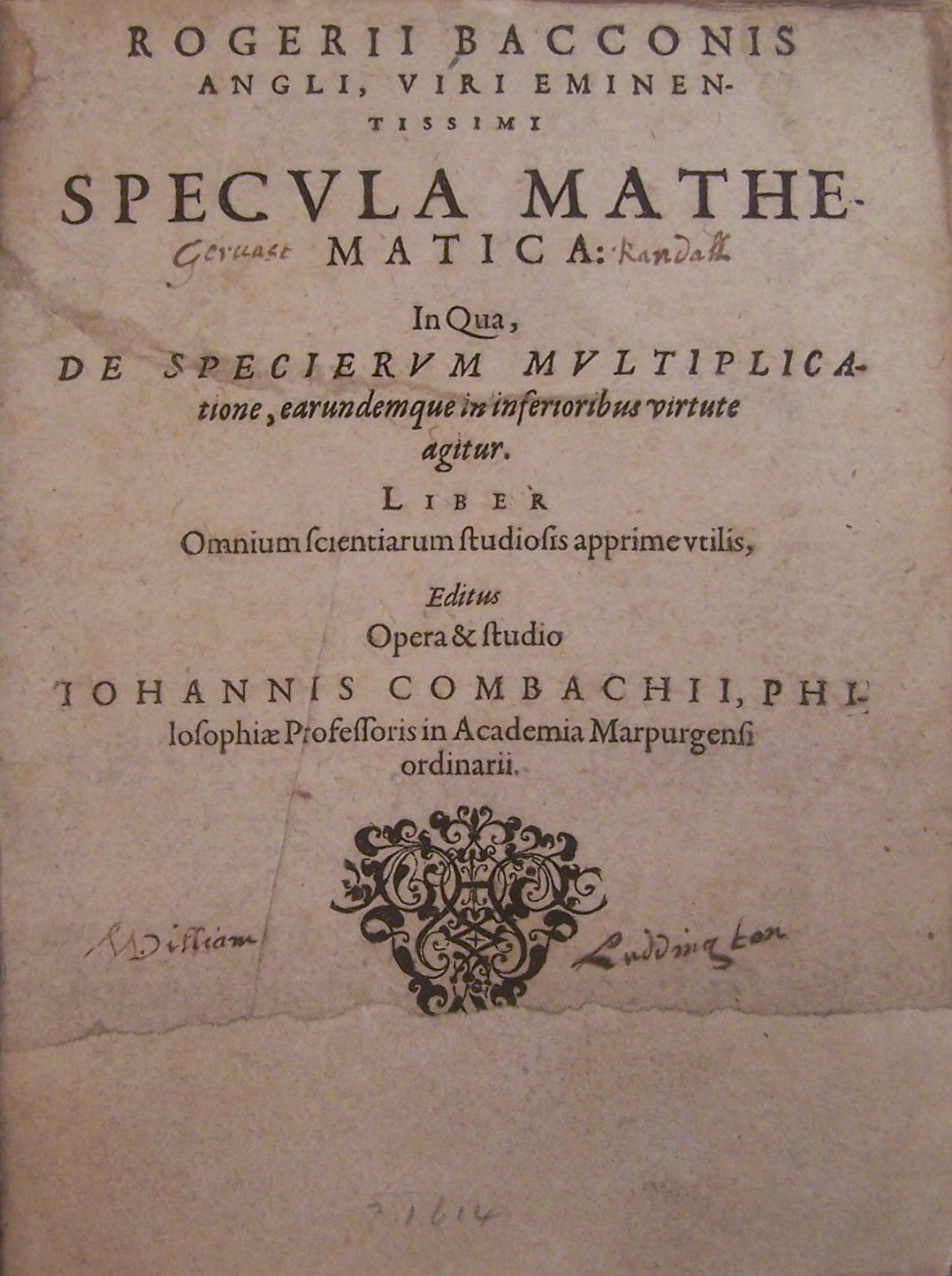 First edition of one of the most important scientific works by the mediaeval natural philosopher and mathematician Roger Bacon (ca. 1220-ca. 1292). It forms a part of his Opus maius, the great encyclopaedia and organon of the 13th century, and at the time was the only part of it to be published. "Part IV contains an elaborate treatise on mathematics, the "alphabet of philosophy", maintaining that all the sciences rest ultimately on mathematics, and progress only when their facts can be subsumed under mathematical principles. This fruitful thought he illustrates by showing how geometry is applied to the action of natural bodies, and demonstrating by geometrical figures certain laws of physical forces." (Enc. Brit.) The German editor, Johann Combach (1585-1651), was professor at the University of Marbach..