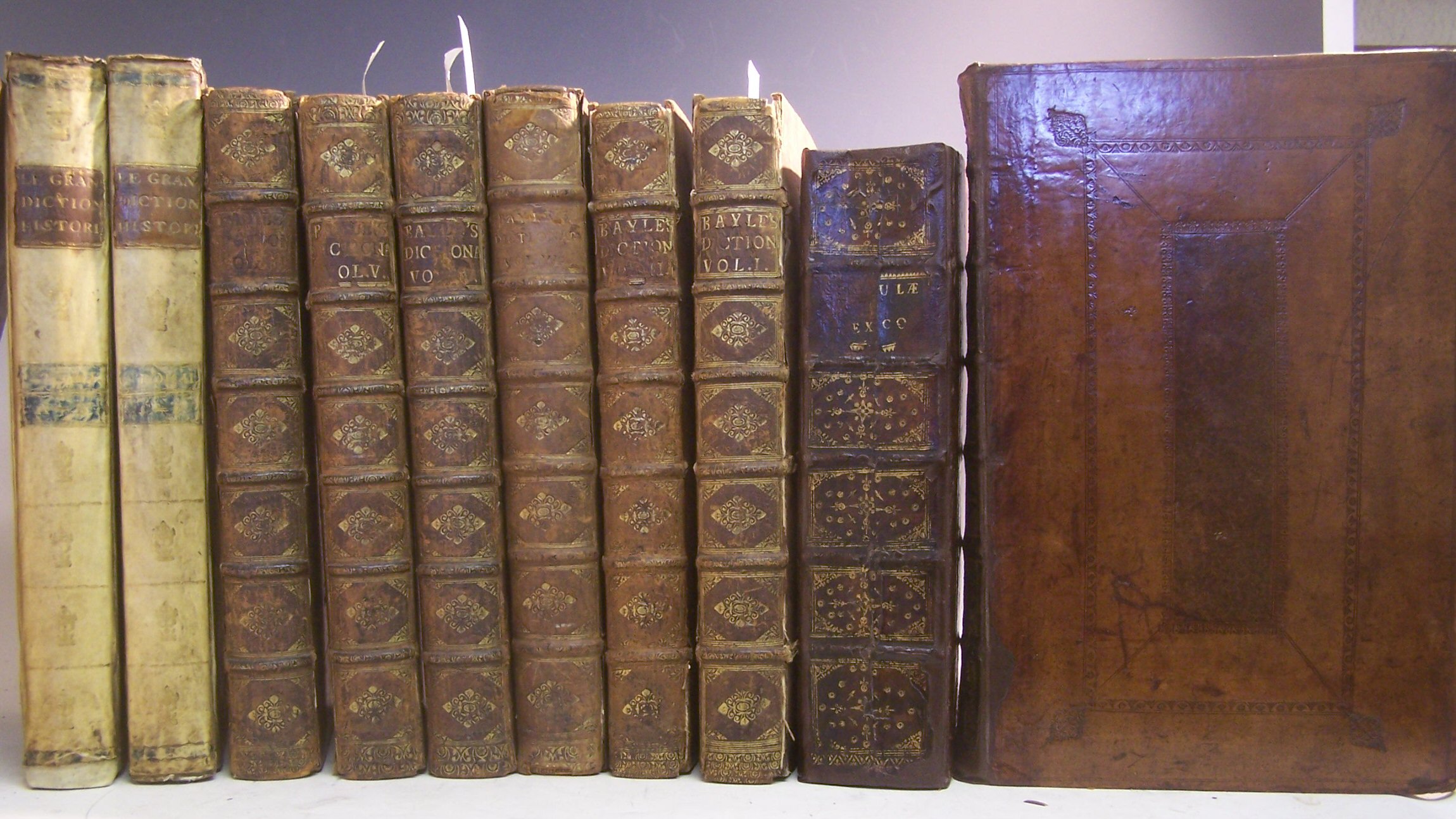 A general dictionary, historical and critical. London: J. Roberts & P. Vaillant, 1734-41, 10 volumes, folio, titles printed in red and black, contemporary panelled calf, spines gilt, rubbed, some joints cracked or splitting, occasional light spotting; Moreri, Louis Le grand dictionaire historique. Amsterdam: George Gallet, 1698, eighth edition, 4 volumes, folio, titles printed in red and black, engraved frontispiece in volume 1, contemporary half vellum with marbled sides, slightly spotted, rubbed and slightly soiled, tears to spine of volume 1; Scapula, Joannes Lexicon Graeco-Latinum. London: J. Norton & R. Whitaker, 1637, folio, title printed in red and black, contemporary calf, [STC 21806], title slightly spotted, rebacked retaining spine, rubbed; Richelet, Pierre Dictionaire françois. Amsterdam: J. Elzevir, 1706, folio, title printed in red and black with woodcut device, woodcut ornaments, contemporary panelled calf, rebacked retaining spine, armorial bookplate of Rt. Hon. Robert Lord Viscount Tamworth; sold not subject to return (16)