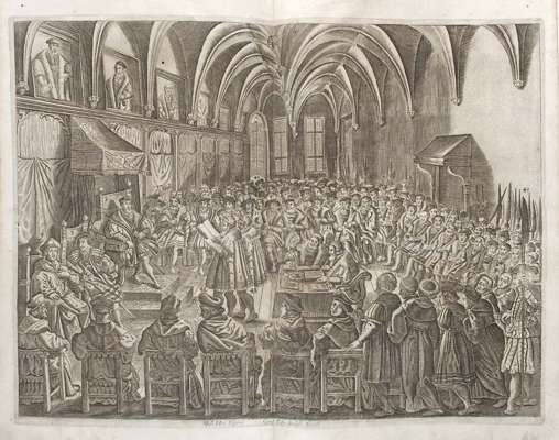 Biblia, Das is Die gantze heilige Schrift altes und neues Testaments deutsch D. Martin Luthers … Nuremberg: Christoph Endter, 1670. Large folio, engraved title-page by Johann Durr after Christian Richter, printed title-page in red and black, engraved portrait of Ernst, Herzog zu Sachsen by Jacob Sandrart after Rudolph Werenfels, with 15 further preliminary plates of a full page coat of arms of the dedicatee, 12 portrait plates, and 2 double-page plates of a plan of Jerusalem and ariel view, 15 engraved plates (including divisional title-pages) and 7 double page plates (including maps and the Diet of Augsburg), contemporary blind stamped and roll tooled pigskin over wooden boards, engraved brass corner bosses and clasps, wear at head and tail, split across leather on lower board, front free endpapers spotted, lower free endpapers water stained, first front free endpaper copiously annotated, occasional marginalia in a contemporary hand, tear in p. 563 (no loss)