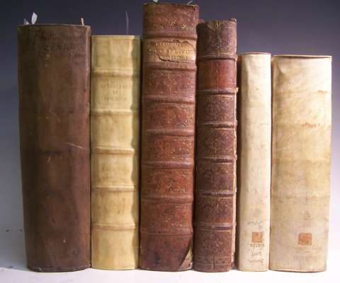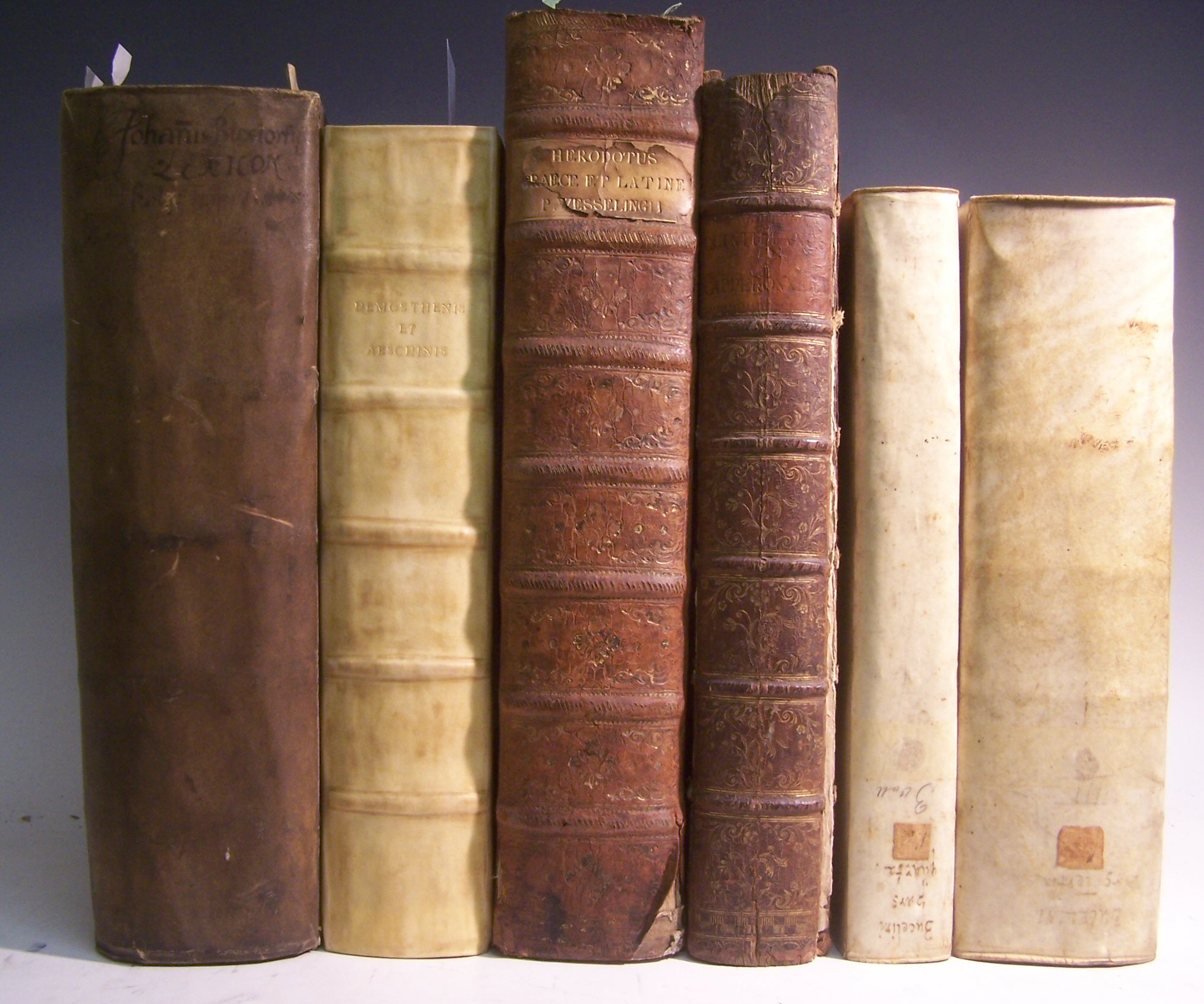 Germaniae topo-chrono-stemmatographicae, sacrae et profanae. Frankfurt: C. Balthasaris, 1671 [Ulm: C. Balthasaris, 1678], volumes 3 and 4 only (of 4), folio, titles printed in red and black with woodcut device, woodcut coats-of-arms, interleaved copies with early annotations, contemporary vellum, bookplates of Baron Linden and Worth abbey; Demosthenes and Aeschines Opera, cum utriusque autoris vita. Geneva. P. de la Rovière, 1607, folio, 2 parts in one volume, woodcut device on title, contemporary blindstamped vellum, some browning and staining, lacking frontispiece, title repaired, rebacked; Buxtorf, Johannes Lexicon Chaldaicum, Talmudicum et Rabbinicum. Basel: L. König, 1639, folio, contemporary vellum, lacking engraved title and frontispiece, binding slightly soiled; Herodotus Historiarum libri IX. Amsterdam: P. Schouten, 1763, large folio, title printed in red and black with engraved vignette, additional engraved title, half-title, folding engraved plate, contemporary mottled calf, some damp-staining and slightly friable in upper margin at end, head and tail of spine rubbed; Quintillianus, Marcus Fabius De oratoria institutione libri XII. Paris: A.U. Coustelier, 1725, folio, title printed in red and black with woodcut device, contemporary calf, rubbed, upper cover detached, slight worming to index fore-margin; sold not subject to return (6)