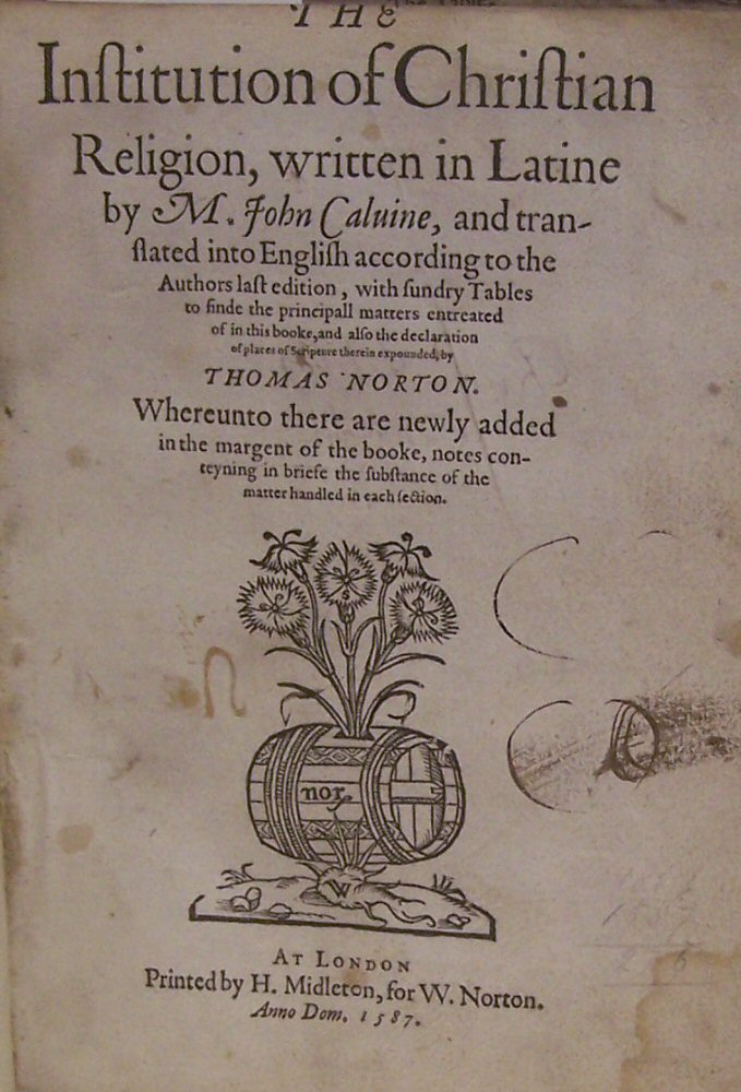 The institution of the Christian religion, translated by Thomas Norton. London: H. Midleton for W. Norton, 1587, 8vo, contemporary panelled calf, title with woodcut device, lacks The Table after 3I1, lacks spine, a little light spotting and soiling, paper flaw to corner of Vv1 affecting a letter, a few leaves lightly damp-stained, first word of title just shaved