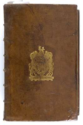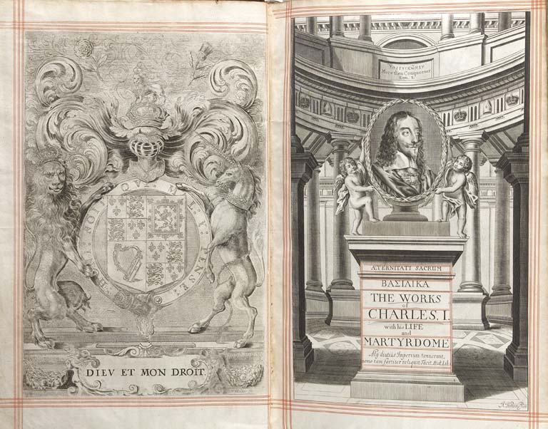 Basilika. The works of King Charles the martyr. London: R. Royston, 1662, folio, 2 volumes in one, engraved frontispiece of royal arms, additional engraved title with small oval portrait of the King and 3 double-page plates, preliminary leaves and plates ruled in red, contemporary calf, royal arms gilt on sides, spine gilt in compartments, upper hinge split, lower hinge partly split at head and tail