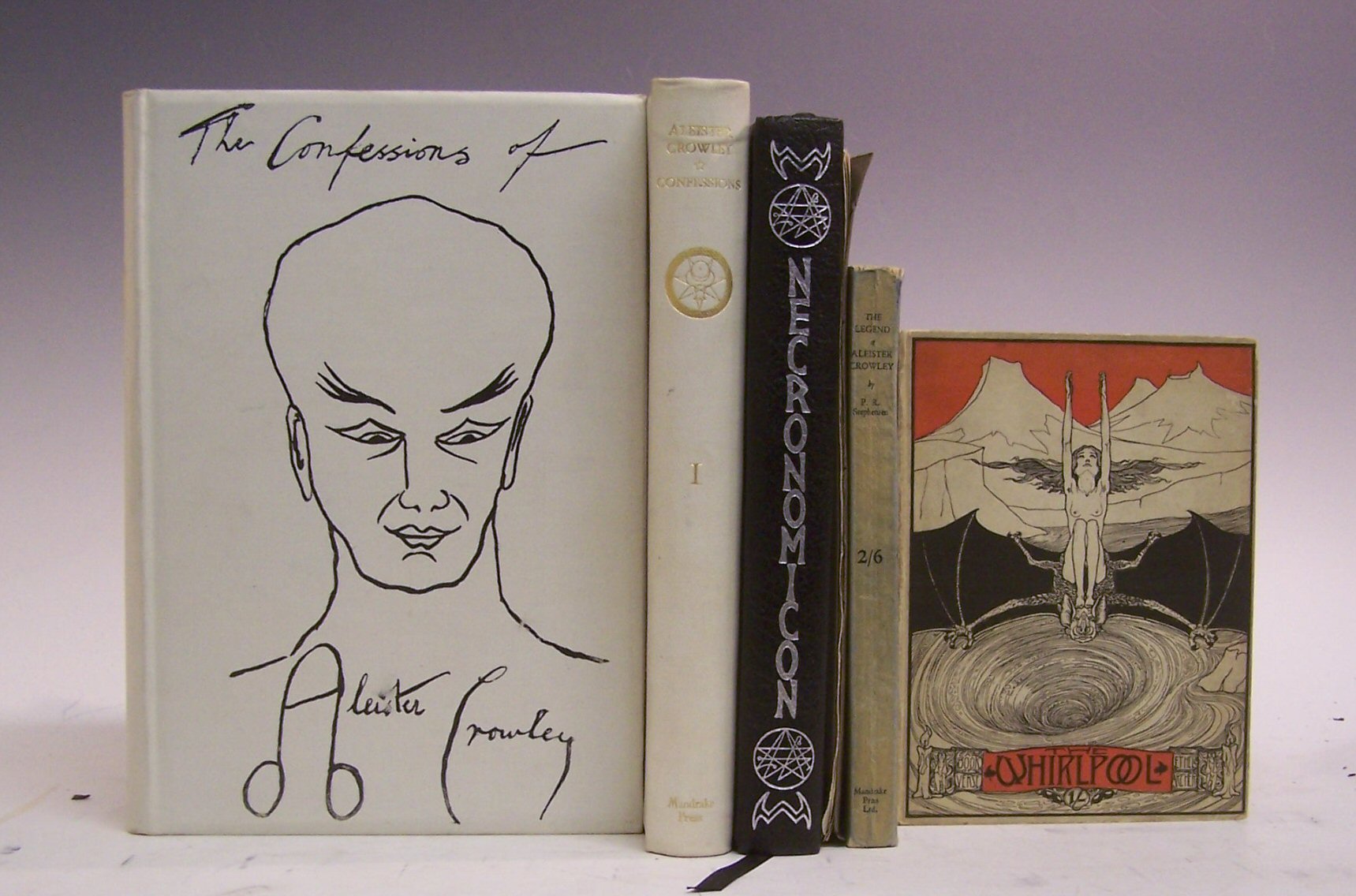 The spirit of solitude, the confessions of Aleister Crowley. London: The Mandrake Press, 1929. First edition, 8vo, 2 volumes, illustrated, with original receipts from Mandrake Press, original cloth gilt, interiors clean; Archer, Ethel The whirlpool. London, 1911, 8vo, original illustrated boards; Crowley, Aleister The rites of Eleusis. London: Chiswick Press, [1910], 8vo, 2 plates, original wrappers, loose, torn at hinge; Stephensen, P.R. The legend of Aleister Crowley. London: Mandrake Press, 1930, 8vo, original paper covers, sunned; Simon Necronomicon. USA, 1981, third edition, 8vo, number 3003 of 3333 copies, decorative morocco gilt, silvered edges; Memorial Aleister Crowley, The last ritual. [No place], 1987, facsimile of book issued to mourners at his memorial service in 1947, number 151 of 200 copies, original paper covers; Crowley, Aleister The Equinox. New York, 1974, 8vo, 10 volumes [volume I, number 1-10], original decorative cloth, rubbed, some foxing to page edges; and 7 others on or by Crowley (24)