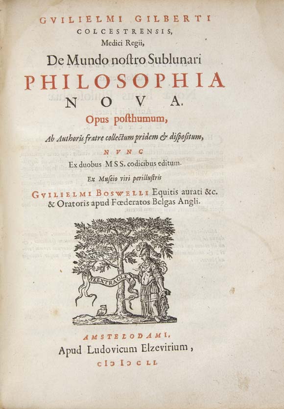 Tractatus de homine et de formatione foetus. Amsterdam: Blaeu, 1686, 4to, title printed in red and black with woodcut device, woodcuts in text, [76], 239, some damp-staining, mainly marginal, early ink inscriptions on title of Josamis Szexenty, Stephani Miskolizi and Andres Marbosahi, two deleted; Forge, Ludovico de la Tractatus de mente humana, ejus facultatibus & functionibus. Amsterdam: Blaeu, 1688, 4to, woodcut device on title page, woodcuts in the text, [22], 241, [7], lacking a preliminary (?blank) leaf, some early scoring and underlining, somewhat damp-stained Gilbert, William, the younger De mundo nostro sublunari philosophia nova. Amsterdam: Ludovico Elzevir, 1651, first edition, title printed in red and black with woodcut device, folding map, woodcuts in the text, worming to G3, H3, I3, K3, L3, M3, N3, P3, Q3, R3, S3 &c affecting a few letters, lacking OO1, somewhat damp-stained, 3 works in one volume, contemporary Dutch blind-stamped vellum, upper joint split, tear to spine, lacking marbled free endpapers