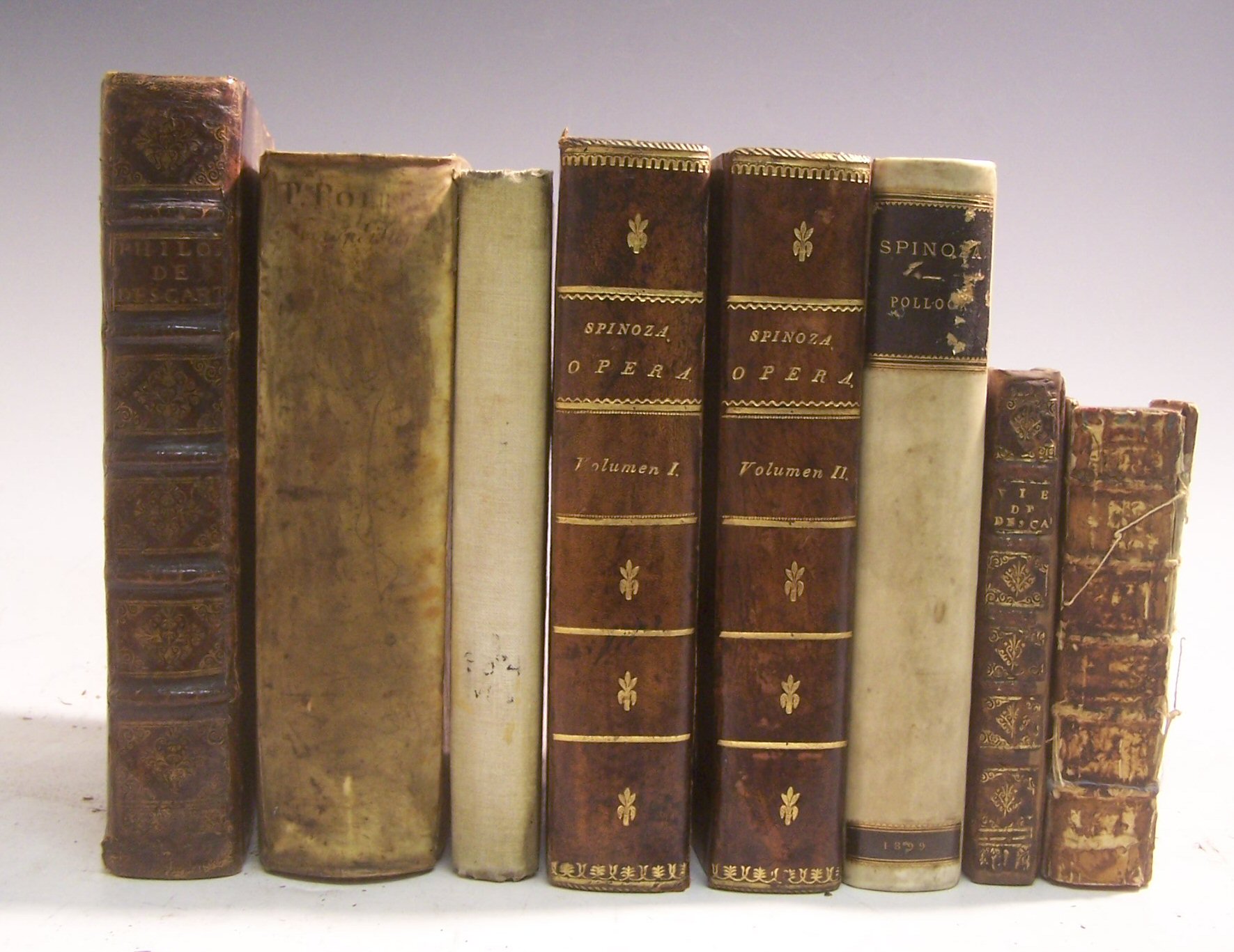Les principes de la philosophie. Paris: T. Girard, 1681, fourth edition, 4to, additional engraved title & 20 engraved plates, folding woodcut plate, contemporary calf, head and tail of spine repaired; Baillet, Adrien La vie de Mr. Descartes. Paris: M. Cramoysi, 1693, 12mo, engraved frontispiece, contemporary calf, joints repaired; Wittich, Christoph Anti-Spinoza. Amsterdam: J. Wolters, 1690, 4to, woodcut device on title, modern cloth-backed boards, bookplate with deaccession stamp and blindstamp on title of University of Chicago, spine soiled; Poiret, Pierre Cogitationum rationalium de Deo, anima et malo. Amsterdam: Blaeu, 1685, 4to, contemporary vellum, dampstain in lower margin of opening leaves, some spotting, covers warped; Salignac de la Mothe, Francois de Refutation des erreurs de Benoit de Spinosa. Brussels [but Amsterdam]: F. Foppens, 1736, 12mo, contemporary calf, very worn, blindstamp on title and deaccession stamp on verso, slight spotting; and 3 others relating to Spinoza (8)