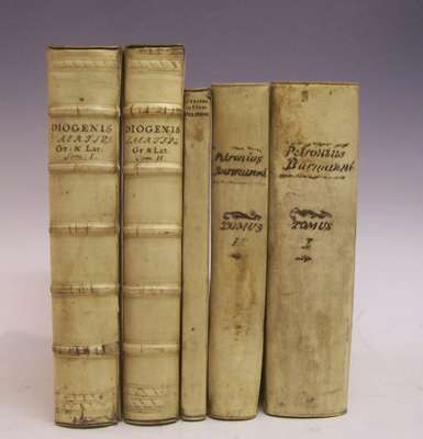 De vitis, dogmatibus et apophthegatibus clarorum philospphorum libri X cum subunctis integris annotationibus Is. Casuboni, Th. Aldobrandini & Mer. Casauboni latinam Amrbrosii versionem complevit & emendavit Marcus Meibomius … Amsterdam: apud Henricum Wetstenium, 1698. 2 volumes, 4to., engraved titlepage, contemporary vellum, central lozenge, upper joint of volume 1 split; Petronius Satyricon … & notis Nicolai Heinsii & Guilielmi Goesii … curante Petro Burmanno … Amsterdam: apud Iansonio-Waesbergios, 1743. 2 volumes, 4to., engraved frontispiece, contemporary vellum; Eutropius Historiae romanae breviarium ab urbe condita … notis … illustravit Anna Tanaquilli Fabri filia … in usum Serenissimi Delphini. Paris: apud viduam Antonii Cellier, 1683. 4to., contemporary vellum, central lozenge (5)