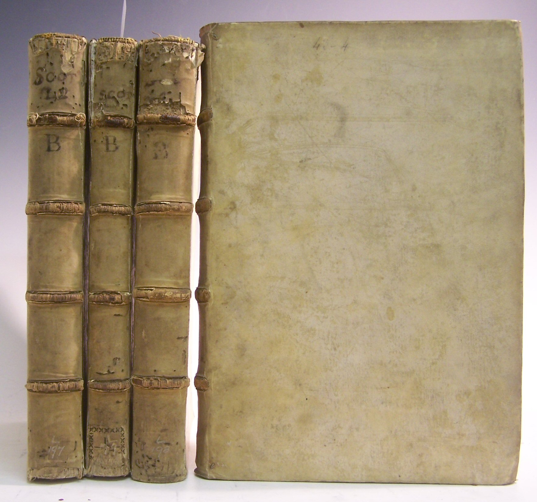 In quatuor libros sententiarum quaestiones. Venice: apud Io Baptistam, et Io Bernardum Sessam (apud haeredes Melchiori Sessae), 1597-1598, 3 volumes, folio, first title in partly hand-coloured engraved border, woodcut devices on other titles, woodcut initials and ornaments, contemporary vellum, wormhole to a few margins, head and tails of spines slightly wormed; and another copy of books 3-4 in one volume (4)