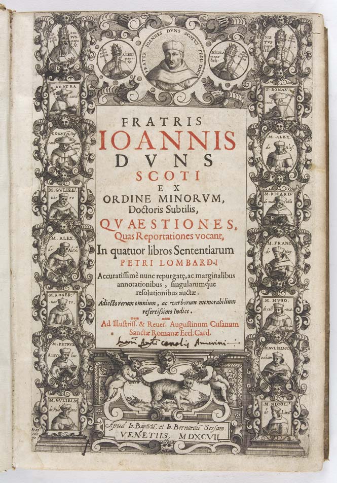 Quaestiones ... in quatuor libros sententiarum Petri Lombardi. Venice: apud Io. Baptistam, et Io. Bernardum Sessam, 1597 folio, title in red and black within engraved border, name on title, [Adams D1119]; In primum sententiarum librum. Venice: apud Bernardum Iuntam, Io Baptistam Ciottum, & socios, 1612, folio, title in red and black with woodcut vignette; Summa Theologica. Rome, 1728-1738, 5 volumes, folio, some staining, all contemporary vellum, rubbed and marked (7)