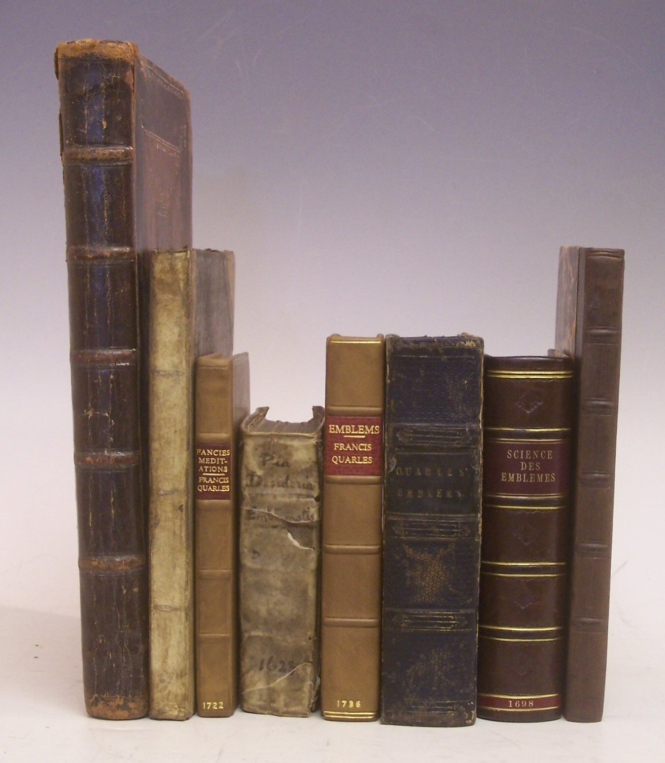 Pia desideria emblematis elegiis... Antwerp: Henrici Aertssenii, 1628, 16mo, woodcut title, 48 woodcuts in text, contemporary vellum, worn, ink underscoring and marginalia, dampstain to lower inner margin of first few leaves [Caillet 5305]; Quarles, Francis Divine fancies digested into epigrams, meditations and observations. London, 1722, ninth edition, 12mo, modern calf gilt, browning to title; Emblems Emblems for the entertainment and improvement of youth. London, [c.1750], 8vo, frontispiece, 62 plates, 20pp adverts at rear, modern quarter calf, interior clean; Wither, George A collection of emblemes, ancient and moderne. London, 1635, folio, 3 [of 4] parts in 1, lacking third part, panelled calf, rebacked, heavily torn and repaired [loss to text in several places]; Quarles, Francis Emblems divine and moral. London, 1823, 12mo, portrait frontispiece, plates, contemporary half calf gilt, hinges cracking, title page repaired, spotting at page edges; and 3 other works on emblems (8)