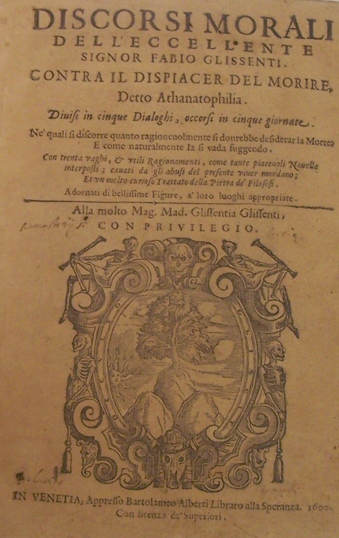 Discorsi Morali ... contra il dispiacer del morire, detto Athanatophilia. Venice: Bartolameo Alberti, 1600-1596, 6 parts in one volume, 4to, woodcut device on titles, numerous woodcuts, recased in contemporary vellum, heavily browned at beginning, title page loose