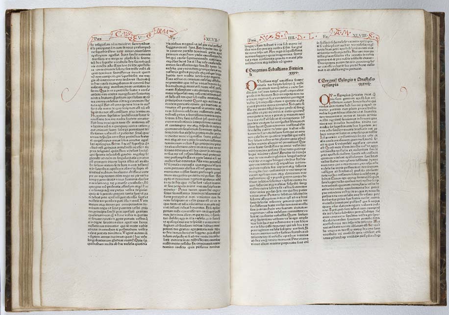 Note: First and only incunable edition of the letters of Pope Gregory the Great. The edition is dated from a rubricator's inscription in a Munich copy. Zainer was the first printer of Augsburg (1468), the first after the "R printer" (Adolf Rusch) of Strassburg to use Roman type in Germany, and the first to introduce woodcut capitals as a regular feature of book production. Goff G-415 (9 copies); Hain 7991*