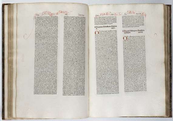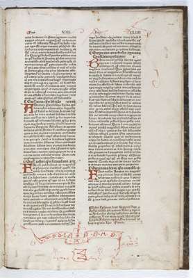 Epistolae. [Augsburg: Gunther Zainer, not after 1476], large folio (403 x 279mm.), 163 leaves of 164 (without 5/7), 59 lines and headline, double column, headings and colophons printed in red, lavishly rubricated with red filling to small capitals and printed paragraph signs, red capital strokes and underlines, various flourishes and ornaments, nineteenth century half mottled sheep, marbled sides, 6/12 and 11/5.6 supplied from a shorter copy, 14/7 rehinged, reinforcements to inner margins of 17/4-6, tear to 17/5 repaired without loss of text, several wormholes to blank margins, some with old repairs, rebacked and repaired with spine laid down