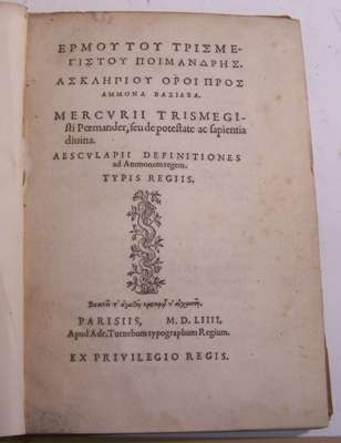 Mercurii Trismegisti poemander, seu de potestate ac sapientia divina. Paris: Adr. Turnbebus, 1554, small 4to, 2 parts in one volume, Greek and Latin title and text, the Greek edited by P. Angelio da Barga, woodcut initials and ornaments, part 2 with final blank, seventeenth century calf, slightly spotted, some light dampstaining to lower margin at beginning, once rebacked and recornerned, rubbed, lower cover detached