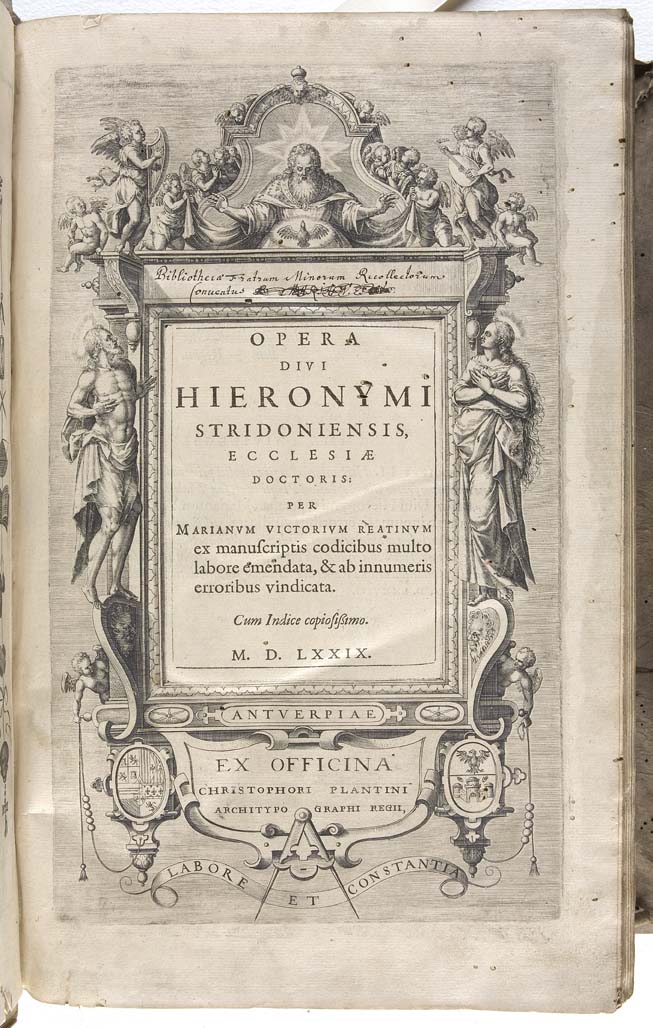 Opera divi Hieronymi stridoniensis. Antwerp: Christopher Plantin, 1578-79, large folio, volumes 1-5 (of 8), edited by Marianus Victorius, engraved frontispiece, additional general engraved title, printed titles with woodcut device, contemporary blindstamped vellum incorporating roll-tooled images of Fortitude, Faith and Charity, lacks one clasp, rather wormed at beginning and end, apparently bound without the dedication leaf