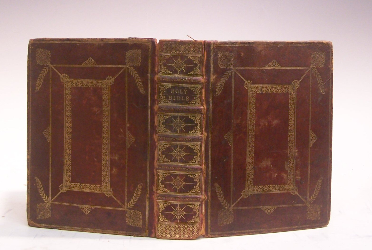 The Bible. London: Robert Barker, 1611 [both titles dated 1610], titles within woodcut borders, engraved divisional titles and plates, several repaired with slight loss, woodcuts in text; The booke of psalmes. London: for the Companie of Stationers, 1612, 8vo, ruled in red throughout, contemporary red panelled morocco gilt, g.e., marbled endpapers, some soiling and spotting, some plates and a few sidenotes just shaved, rebacked with original spine laid down, rubbed, joints split