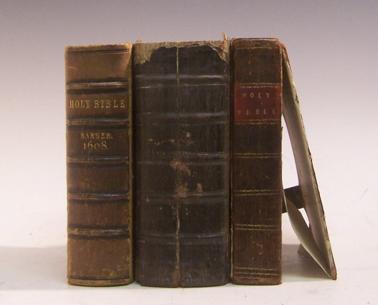 The Bible, that is the Holy Scriptures. London: Robert Barker, 1606, 4to, titles within woodcut borders, lacking leaf before title, woodcuts, eighteenth-century calf, some spotting and water-staining, rubbed, upper cover detached, lacks one clasp; The Bible, translated according to the Ebrew and Greeke. London: Robert Barker, 1608, 4to, titles within woodcut borders, nineteenth-century brown morocco, first border cut round and remounted, several leaves repaired with loss, some headlines cropped, rather soiled, ink inscription on N.T. title, rubbed; The Bible, translated according to the Ebrew and Greeke. London: Christopher Barker, 1599, 4to, contemporary panelled calf, imperfect, lacking New Testament title, very soiled and defective; sold not subject to return