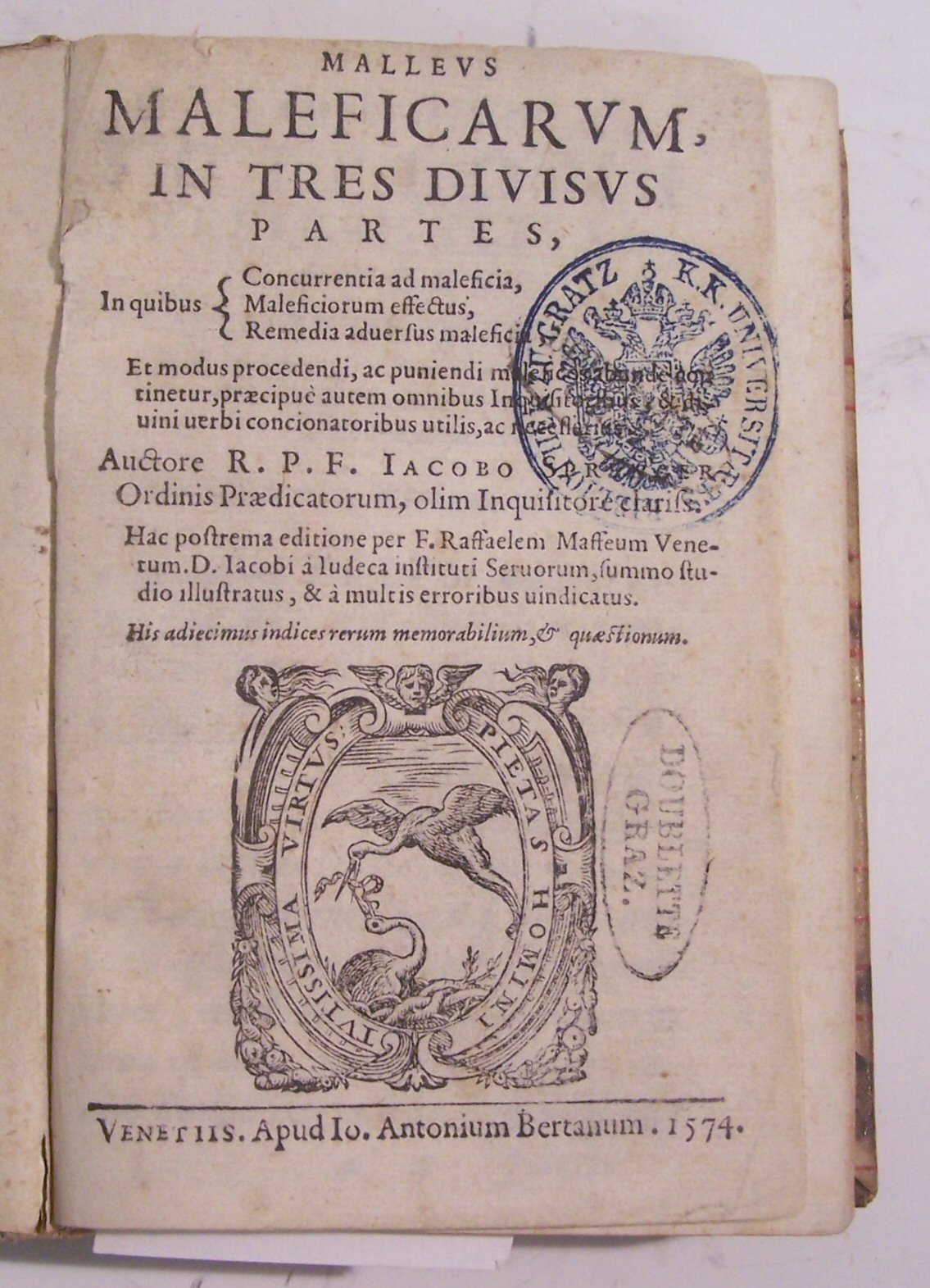 Malleus maleficarum, in tres divisus partes. Venice: J.A. Bertanus, 1574, small 8vo, woodcut device on title, old vellum, lacks M8 and final blank leaf