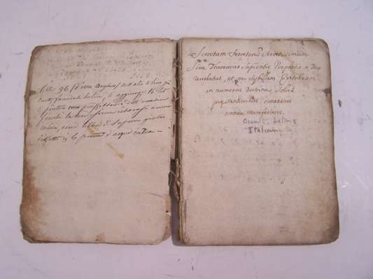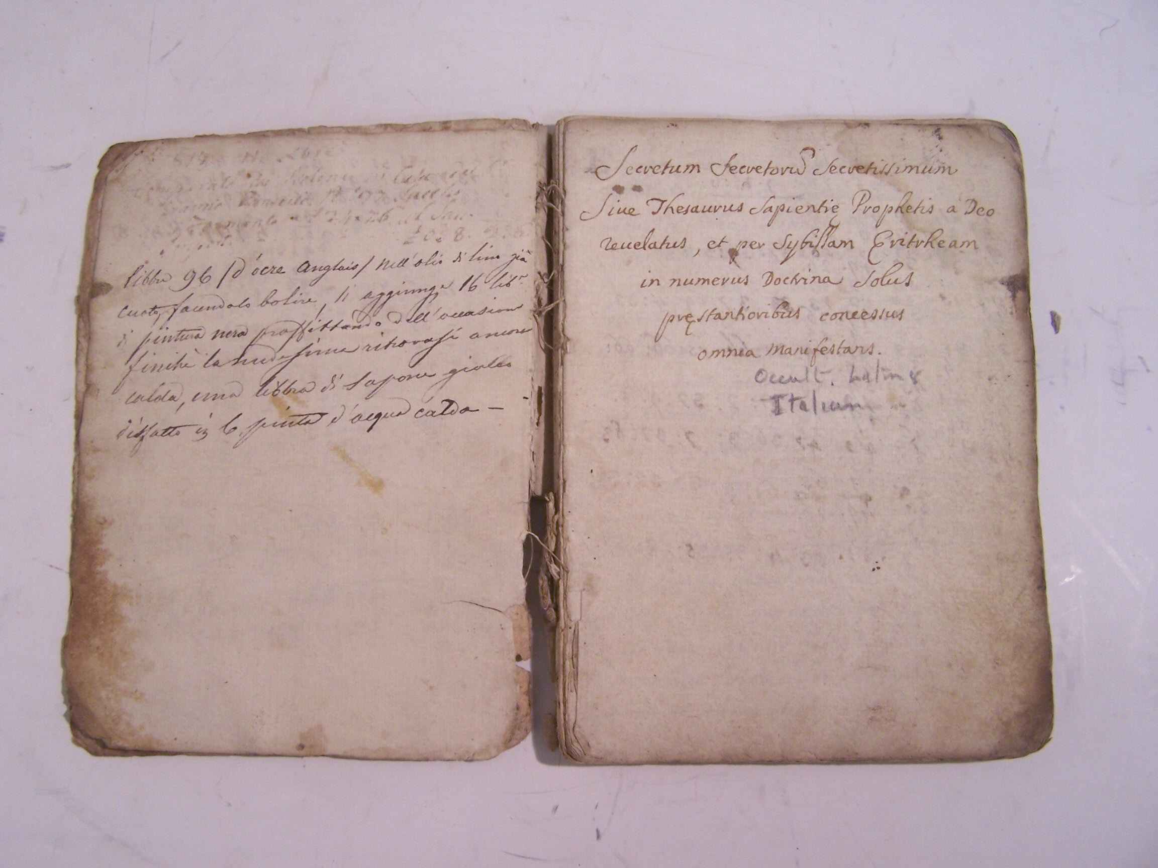Secretum secretorum secretissimum sive thesaurus sapientae prophetis a de revelatus, et per Sybillam Eritrheam in numerus doctrina solus prestantionibus concessus omnia manifestans, Italian manuscript, small 4to, 72 folios, plus two loose inserted fragments, largely from 1740-60, with some later additions up to 1808, containing a variety of simple vaticinatory/cryptographic games, referred to as "Cabala", based on basic literal-numeral substitutions, the first 12 pages in Latin, the remainder in Italian