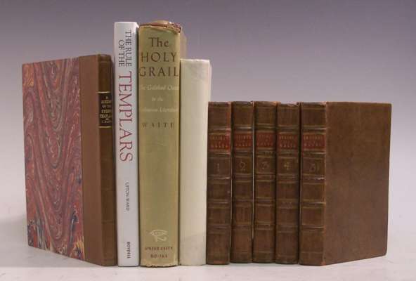 A sketch of the history of the Knights Templers. Edinburgh, 1837, 8vo, presentation copy from author to James Aspinall, moder quarter calf gilt, a.e.g., very clean throughout; Vertot, Rene Aubert de The history of the Knight Hospitallers of St John of Jerusalem... and at present the Knights of Malta. London, 1763, 8vo, 5 volumes, contemporary calf gilt, red label, rubbed at extremities; Whistlecraft, William & Robert The monks and the giants... intended to comprise the most interesting particulars relating to King Arthur and his round table. London, 1821, fourth edition, 8vo, contemporary half morocco gilt, some foxing; and 10 volumes on King Arthur, the Holy Grail and Knights Templers (17)