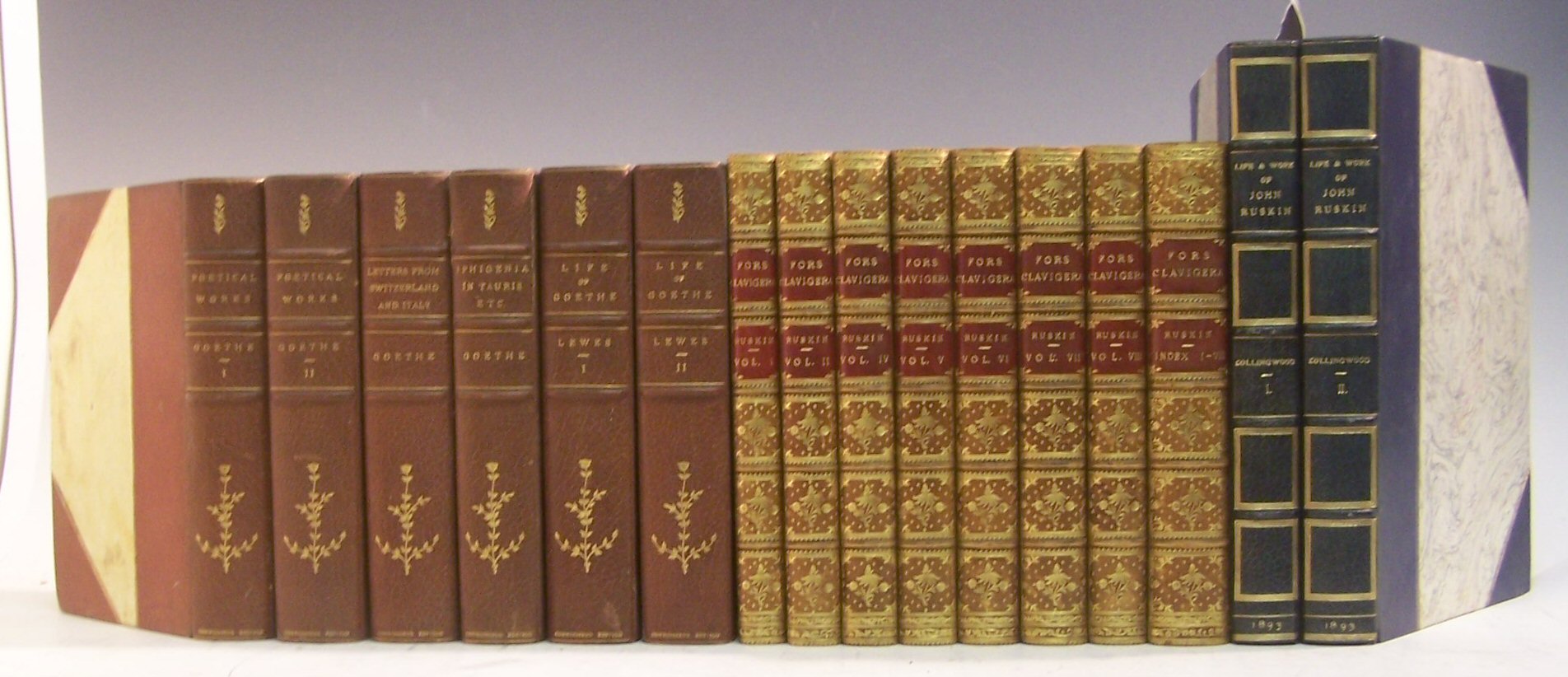 Works… Boston: Francis Niccolls, 1902, Connoisseur Edition, 8vo, 12 [of 14] volumes, one of 150 copies, illustrated, [with] Lewes, George Henry Life of Goethe, 2 volumes [with] Schiller, Friedrich Poetical works, all in original half morocco gilt, rubbed at edges, some fading to backstrips, some worming to hinges, The Tragedy of Faust Part 1 lacking title [with] Lewes, ex-library bookplates removed, stamped on verso of titles; Ruskin, John Fors clavigera... Orpington, 1871-87, 8vo, 8 [of 9] volumes, contemporary calf gilt, red labels, some light rubbing; Collingwood, W. The life and work of John Ruskin. London, 1893, 4to, 2 volumes, number 57 of 320 copies, signed by the publisher, tipped in colour frontispiece, plates, later half blue morocco gilt, some fading to backstrip; Dacre, Lady Barbarina Poems... London, 1821-36, 8vo, 3 volumes, decorative vellum gilt, red and black labels, interiors clean; Grimm, M.M. German popular stories... London, 1826, 8vo, 2 volumes, illustrated by George Cruikshank, contemporary half calf, worn, boards loose, tape repairs to inner hinges, prelims loose in volume I, heavily stained throughout; and a quantity of works of 19th Century literature (quantity)