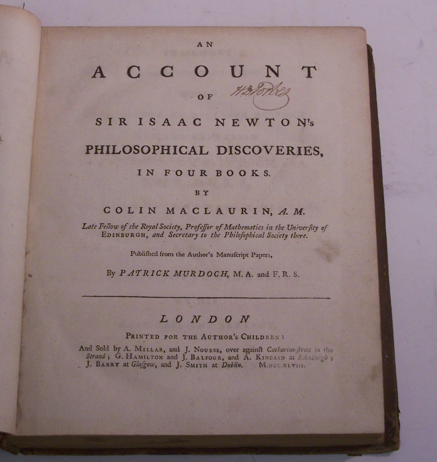 An account of Sir Isaac Newton's philosophical discoveries. London: for the author's children, 1748, first edition, 4to, 6 folding engraved plates, half-title, list of subscribers, contemporary calf, head of spine and corners rubbed, upper joint splitting, early ink scoring to the Life of the Author