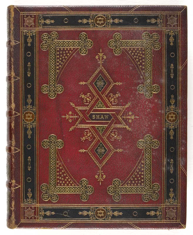 Illuminated ornaments selected from manuscripts of the Middle Ages. London: William Pickering, 1833, folio, engraved title, 59 plates, hand-finished and illuminated in gold and colors by Henry Shaw, late 19th century red morocco gilt extra with onlay of black, brown and moss green, elaborately tooled in gilt, central interlocking geometric pattern, rubbed at edges, upper board slightly darkened, foxing to endpapers