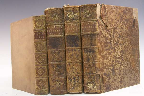 Paradise regained. London: J. & R. Tonson & S. Draper, 1752; Paradise Lost, 1754, 2 volumes, third edition, edited by Thomas Newton, 4to, engraved portrait and plates, contemporary calf, worn; Camoens, Luis de The lusiad, Oxford: Jackson & Lister, 1776, 4to, translated by W.J. Mickle, list of subscribers, contemporary calf, spine gilt, head of spine slightly rubbed (4)
