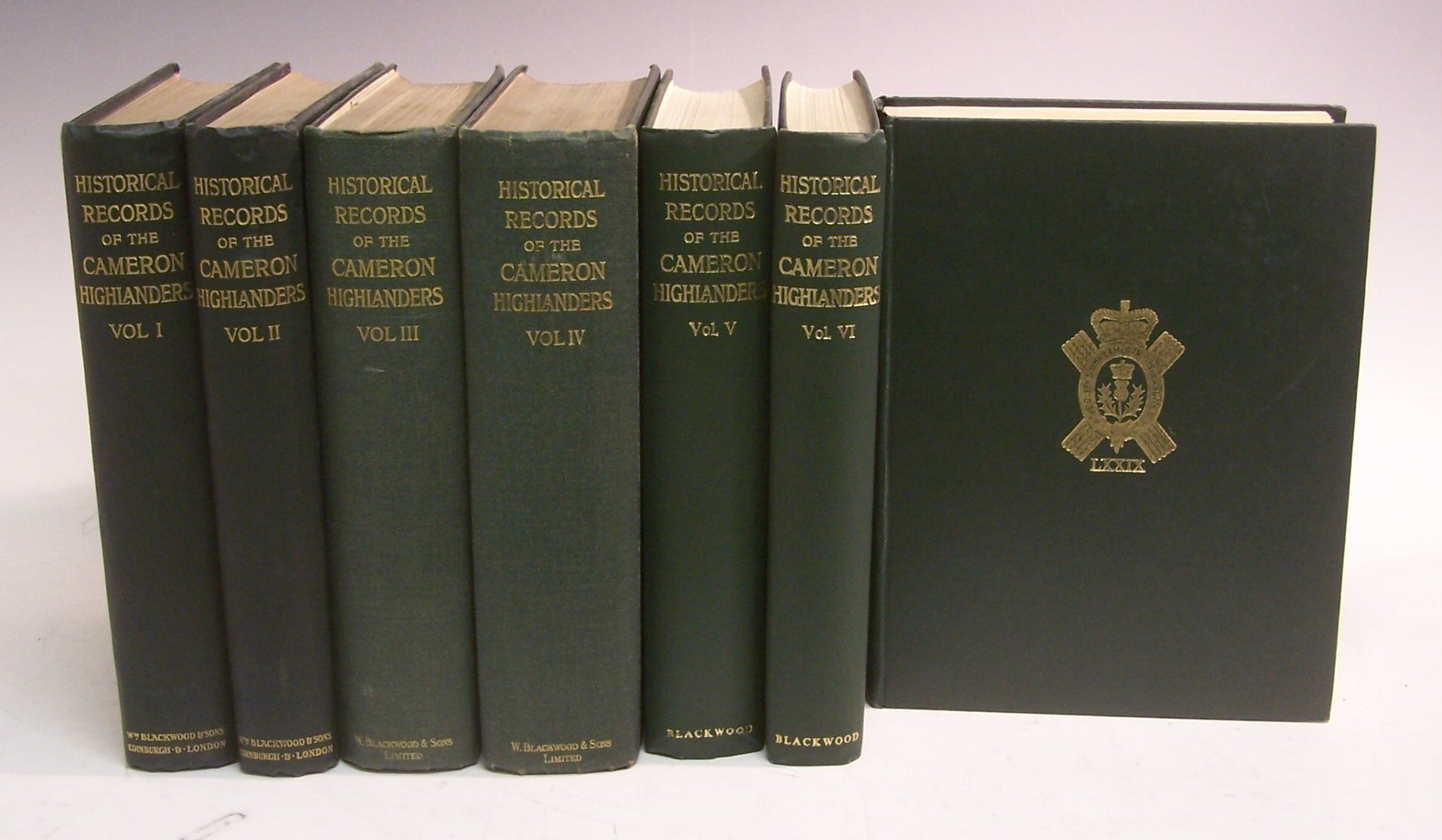 Historical records of the Queen's own Cameron Highlanders. Edinburgh & London, 1909-1962, 7 volumes, 8vo, illustrated, later green cloth gilt, a very clean set (7)