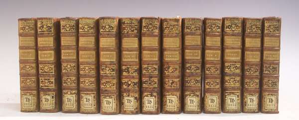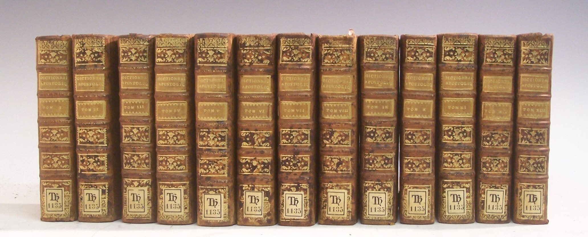 Dictionnaire apostolique... Paris, 1755-1758, 8vo, 13 volumes, contemporary speckled calf gilt, yellow morocco labels, marble endpapers, paper labels on backstrip, some rubbing to edges and another set in similar bindings; and 22 other 8vo volumes in similar speckled calf gilt. Sold not subject to return (48)