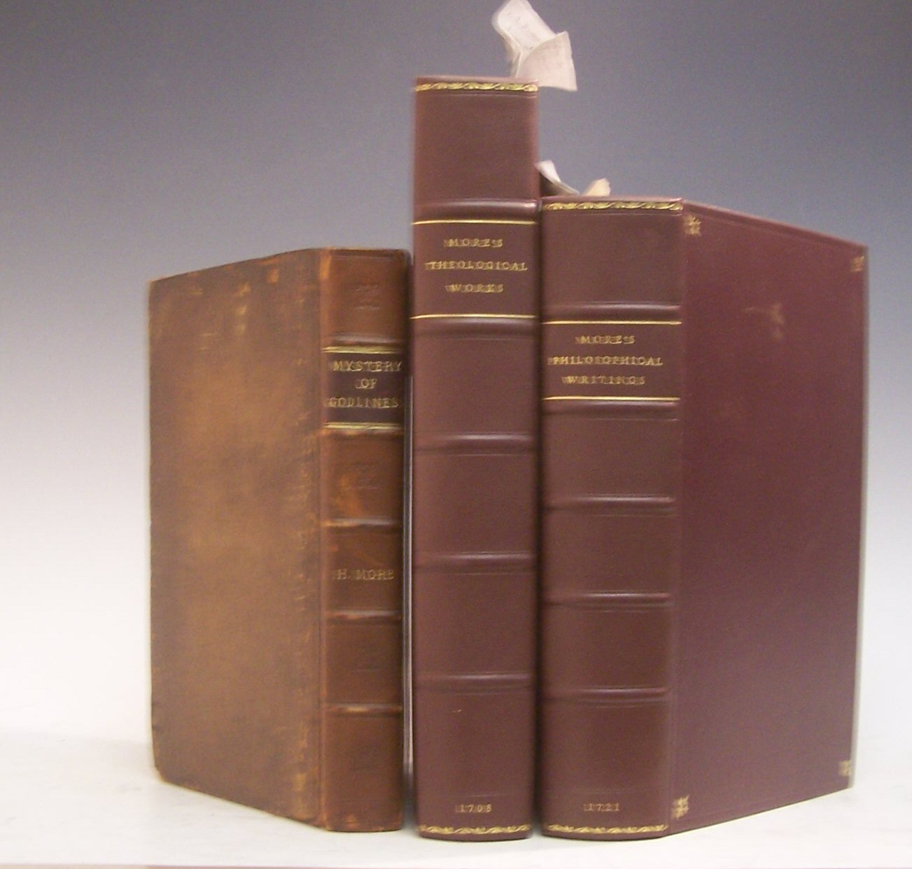 An explanation of the grand mystery of Godliness... London: for W. Morden, 1660, folio, xxx 546 [28], contemporary calf, rebacked, worn at edges, 18th & 19th century inscriptions to title, bookplate [Wing M2658]; Ibid. The theological works of... London, 1708, folio, [2] xiv 856, portrait frontispiece, modern morocco gilt, new endpapers; Ibid. A collection of several philospohical writings... London, 1712, folio, modern morocco gilt [uniform with previous], new endpapers, page edges weak and fraying throughout volume (3)