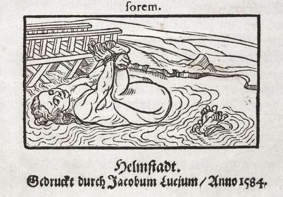 Note: An account of ordeal by immersion in water, a favourite method of determining the guilt or innocence of those accused of witchcraft. If the suspect floated they were found guilty, if they sank they were innocent. The chief European exponent of the swimming of witches was Wilhelm Adolf Scribonius, against whose views this pamphlet was written. Not in Adams.