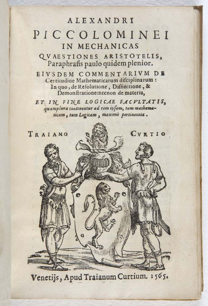 Second edition of this paraphrase and commentary by Alessandro Piccolomini of a work attributed at that stage to Aristotle, it contains an important early formulation of the theory of impetus.It was first published in 1547. It is accompanied by his essay “De certitudine mathematicarum disciplinarum .” Piccolomini was the first to compose an extended commentary on the Questions of mechanics. “The most interesting section is a discussion of the conflicting doctrines of antiperistatis and impetus with regard to the problems of projectile motion and acceleration of free fall. Piccolomini’s account shows the degree to which even an orthodox Aristotelian was aware by the mid-sixteenth century of the difficulties in this matter” (Drake & Drabkin, Mechanics in sixteenth-century Italy, p.51).