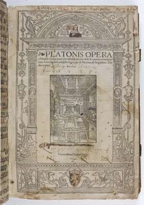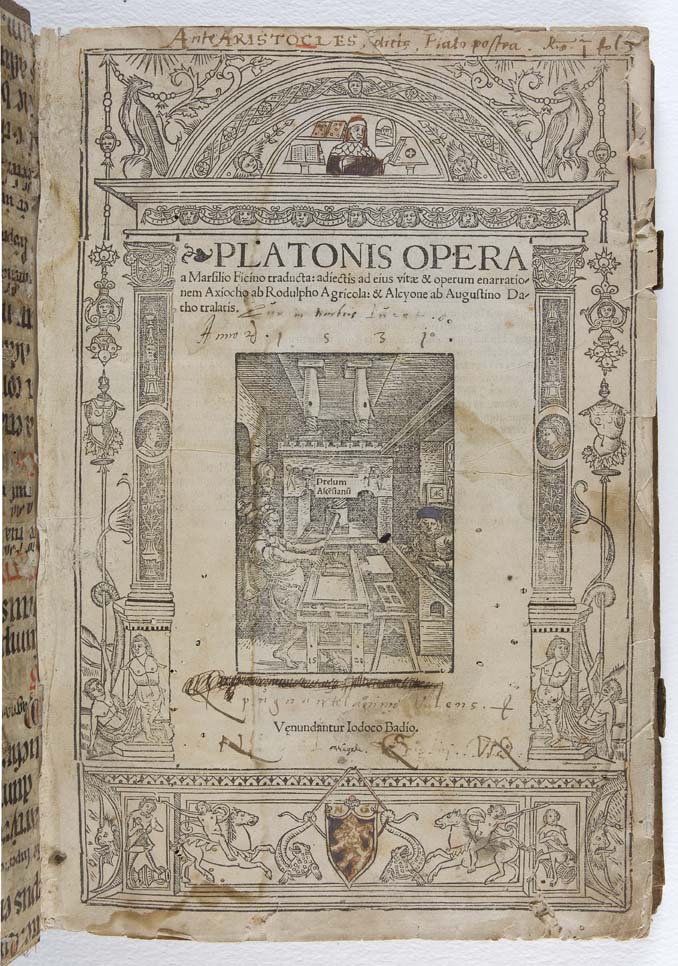 Opera a Marsilio Ficino traducta: adiectis ad eius vitae & operum enarrationem Axiocho ab Rodulpho Agricola: & Alcyone ab Augustino Datho tralatis. Paris: venundantur Iodoco Badio, [1522]. Folio, titlepage with an elaborate archetonic border, device of printing press on the titlepage , large crible initials, contemporary blind stamped and roll tooled pigskin over wooden boards, edges worn, remains of clasps, lacking front free endpapers, ownership inscription on the titlepage, titlepage detached and edges a little frayed, library stamps on the verso of the titlepage, small library stamp in the outer corner of f. 1 of text, single worm holes, some marginalia in an early hand, water staining of the upper margin
