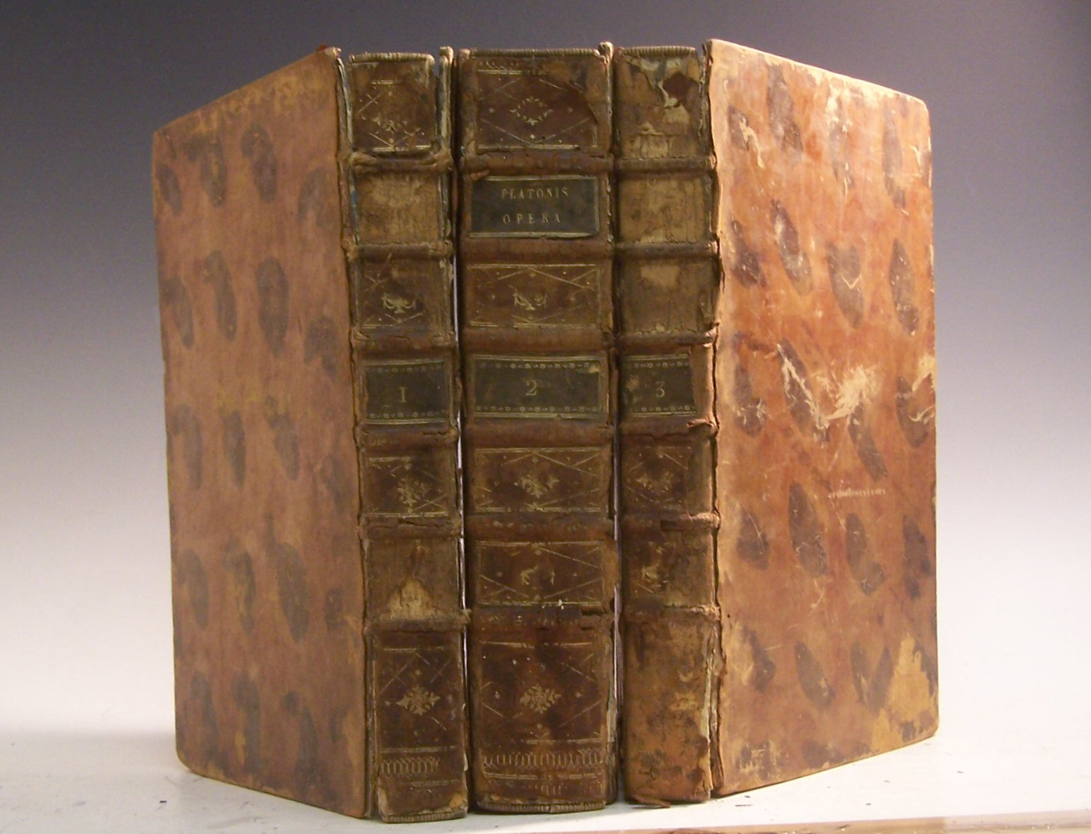 [Greek title] Opera quae extant omnia ex nova Ioannis Serrani interpretatione, perpetuis eiusde[m] notis illustrata … Henr. Stephani de quorundam locorum interpetatione iudicium, & multorum contextus gareci emendatio. [Geneva]: excudebat Henr. Stephanus, 1578. First complete edition, 3 volumes, large device on the titlepage, text in two columns of Latin and Greek, decorative woodcut intials and headpieces, leaves *** IV & V in volume 1 present in duplicate,18th century mottled calf, worn and rubbed, hinges split, titlepage a little dusty and with early ownership inscriptions, occasional light spotting, some marginal waterstaining in volume 3 (3)