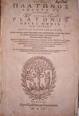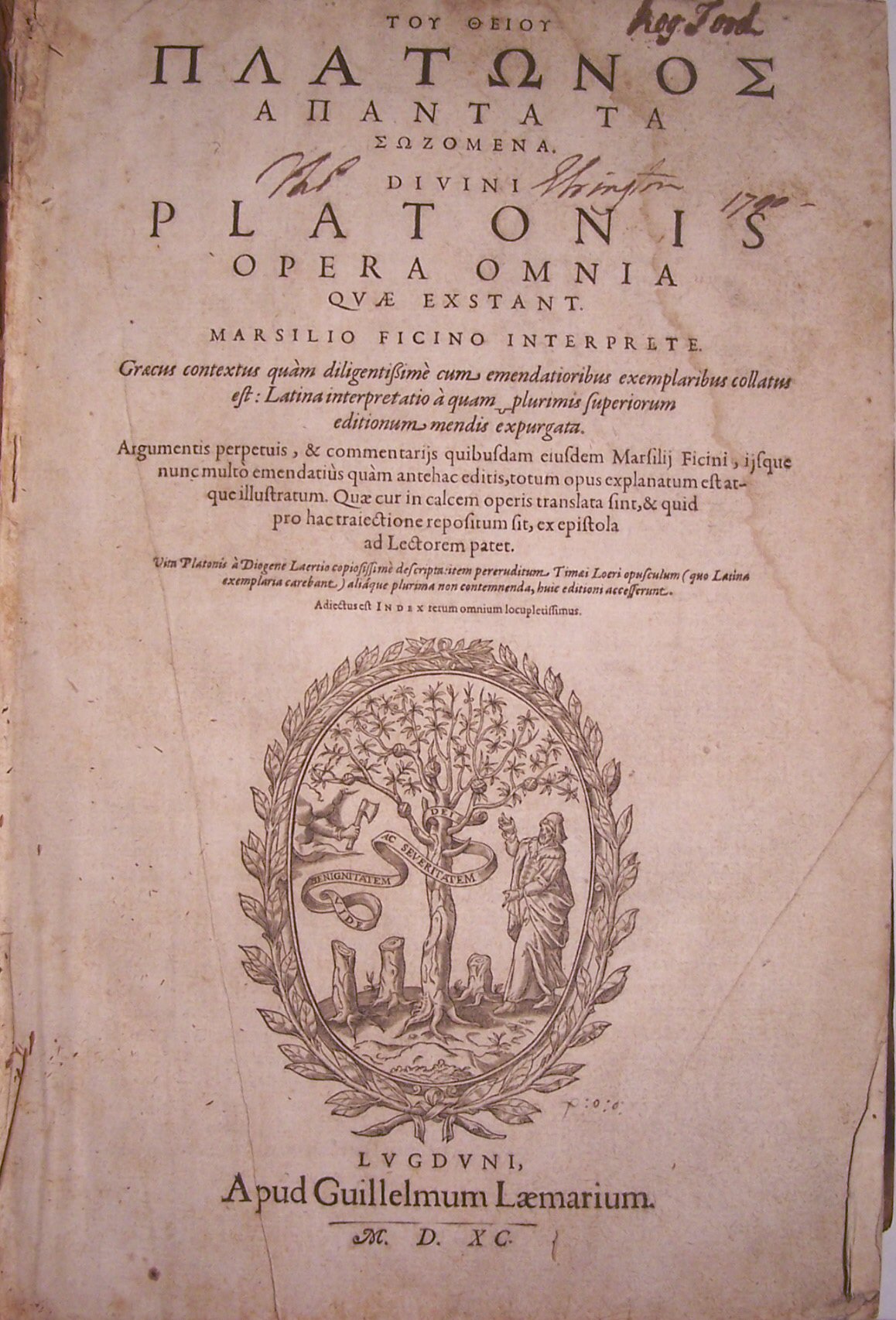 [Greek title] Opera omnia quae exstant Marsilio Ficino interprete … Lyons: apud Guillelmum Laemarium, 1590. Folio, large device on the titlepage, text in two columns of Latin and Greek,later calf, worn and rubbed, boards detached, title-page dusty and partly waterstained, some light paper discolouration throughout, water staining of the margins of the last few leaves, repair to margins of last leaf
