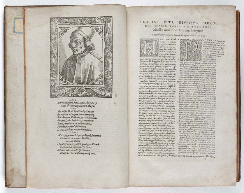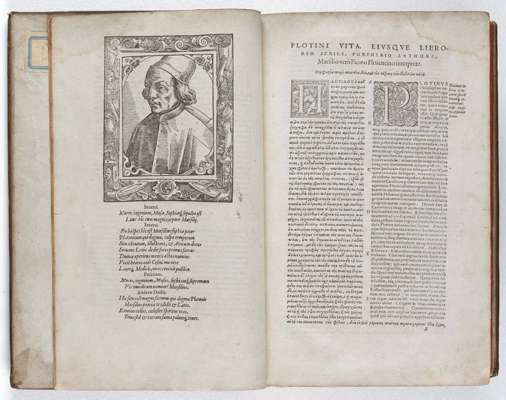 Operum philosophicorum omnium libri liv. in sex Enneades distributi ex antiquiss. codicum fide nunc primum Graecè editi, cum Latina Marsilii Ficini interpretatione & commentatione (with the Life of Plotinus by Porphyrius). Basel: Perneas Lecythus [i.e. Pietro Perna], 1580, folio, parallel Greek and Latin text, woodcut device on title, Ss8 and final recto, woodcut initials, woodcut portrait of Ficino on verso of a6, contemporary calf, lower corner of title restored, some spotting and occasional light discolouration, damp-staining chiefly confined to upper margin, title with small ink-stain and single wormhole in upper margin, rebacked, scrapes neatly repaired