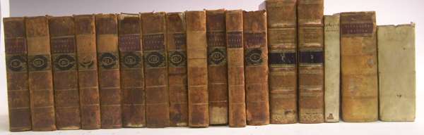 Quae supersunt omnia, Graece et Latine. Leipzig, 1774-82, 8vo, 12 volumes, 6 frontispieces, contemporary half calf, worn, some boards loose, labels lacking on most volumes, heavy foxing and offsetting, bookplate of Wynford in each volume; Longinus, Dionysius De sublimitate commentaraius, quem nova versone donavit... Amsterdam, 1733, 8vo, engraved frontispiece, title in red and black, text in Greek and Latin, contemporary vellum, ink notes in Greek on endpapers, inscripition of J.A. Ernesti, 1734 [German classicist and philologist]; Opsopoeus, Johannes Sibyllina oracula. Paris, 1599, 8vo, 3 parts in 1, engraved title page, contemporary vellum, later morocco label, ink notes on front endpapers, ink inscription on title, worn at rear [no loss to text]; Philostratus De la vie d'Apollonius Thyaneen...Paris, 1611, 4to, 2 volumes, lacking title of vol. 2, later quarter calf gilt, rubbed, slight spotting; Lucian, of Samosata Opera. Saumur, 1619, 8vo, 2 volumes, contemporary vellum, ink notes on endpaper of volume 1, some staining; Cicero, M.T. Librorum philosophicorum uolumen primum. Strasbourg, 1541, 8vo, contemporary roll-tooled vellum over boards, clasps, ink notes on endpapers, public library stamp; Ausonius, Decimus Magnus Opera... in usum Serenissimi Delphini. Paris, 1730, 8vo, 2 parts in 1 volume, edited by Julianus Floridus, engraved frontispiece, contemporary calf gilt, lacking backstrip, boards loose [with frontispiece attached], water staining throughout and 12 other volumes of continental classics (32)