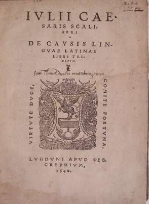 De causis linguae latine libri tredecim. Lyons: Seb. Gryphius, 1540, 4to, woodcut device on title, woodcut initials, some early annotations and scoring, eighteenth century panelled calf, damp-stained at beginning and end, lacks final blank, upper joint split, head of spine rubbed