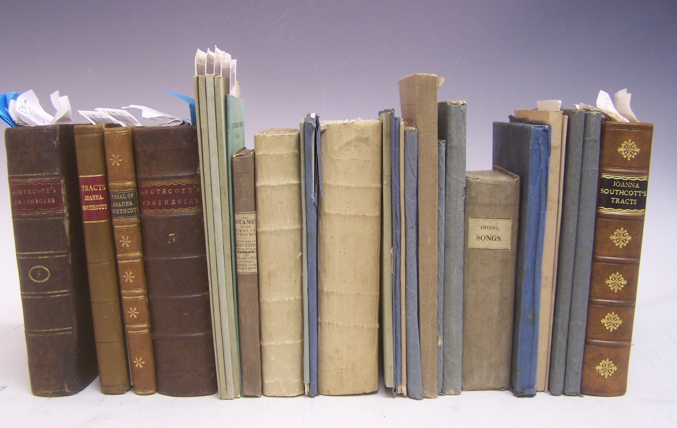 The answer to Thomas Paine's third part, 1812; Wisdom excelleth the weapons of war, drop-head title, 1814; Copies of letters sent to the clergy of Exeter, 1813; bound with another, half calf gilt; The trial of Joanna Southcott, 1804, quarter calf gilt; Letters and communications, Stourbridge, 1804, bound with 16 others, similiar, in 2 volumes numbered on spine vol.3 and 5, one tract defective, contemporary calf; The kingdom of Christ is at hand, [c.1805], bound with 9 others, similar, half calf gilt, a few leaves slightly dust-soiled; Muggletonians--Saddington, J. A prospective glass for saints & sinners, 1823, wrappers, uncut; Tomkinson, T. The harmony of the three commissions, 1822; Ibid. The Muggletonian principles prevailing, 1822, wrappers, uncut; Ibid. Truth's triumph, 1823, original boards, uncut; Ibid. Divine Songs of the Muggletonians, 1829, original boards, uncut; Groshead, R., translator The testament of the twelve patriarchs, 1837, original boards; Reeve, J. and L. Muggleton. A volume of spiritual epistles, 1820, original boards, uncut; and 16 other Muggletonian reprinted pamphlets, very clean (quantity)