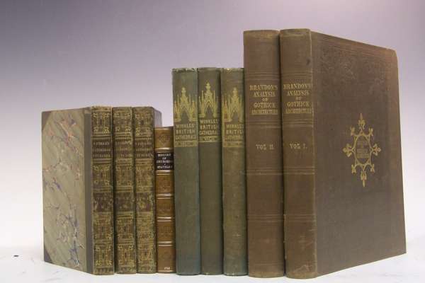 History and antiquities of the cathedral churches of Great Britain. London: Rivingtons, et al., 1814-19, 8vo, 4 volumes, engraved titles, 246 plates, 19th century half green morocco gilt, backstrips rubbed, some foxing; Staveley, Thomas The history of churches in England. London, 1712, 8vo, a folding plate, modern quarter calf gilt, ink notes on prelims, ink inscription to title, foxing and browning; Rackham, Bernard The ancient glass of Canterbury cathedral. London, 1949, 4to, colour plates, original cloth gilt, slipcase, some slight fading to backstrip, some light foxing to page edges; Moule, Thomas Winkle's architectural and picturesque illustrations of the cathedral churches of England and Wales. London, 1838, 8vo, 3 volumes, from drawings by Robert Garland, 177 plates, 3 engraved titles, original cloth gilt, sunned; Brandon, R. & J.A. An analysis of gothick architecture. London, 1860, new edition, 4to, 2 volumes, original cloth gilt, sunned, heavily foxed (10)